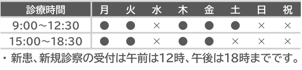 ※新患の患者様および過去に来院されたことのある方で新規診察をご希望の患者様の受付は、午前は12時まで・午後は18時までとさせていただいております。